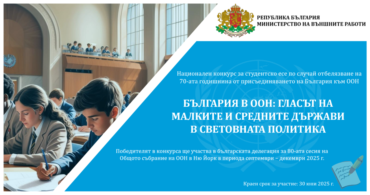 През 2025 г. България отбелязва 70-годишнината от своето членство в Организацията на обединените нации (ООН) – ключов момент в утвърждаването на страната на международната сцена. По този повод Министерството на външните работи обявява национален конкурс за студентско есе, насочен към младите хора, които проявяват интерес към въпросите на международната дипломация и ангажираността на ООН.