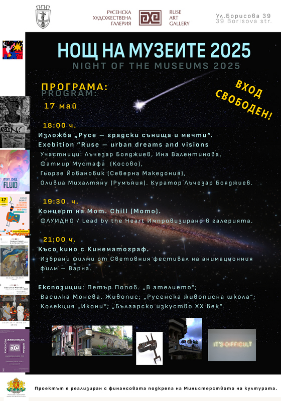 На 17 май (събота) Художествена галерия – Русе ще се включи в Европейската нощ на музеите 2025 с вечерна програма, която съчетава съвременно изкуство, музика и кино. Събитието цели да предостави разнообразно културно съдържание и да ангажира публиката с актуални артистични практики от България и региона.